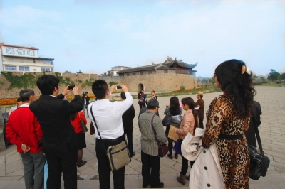 图为两岸古堡文化交流团成员在永昌堡外拍照留念。