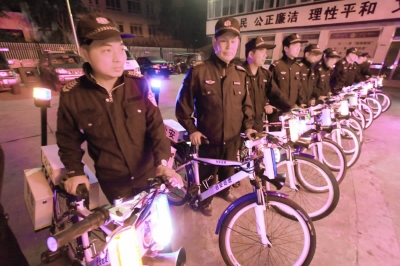 今年9月份,区公安分局开展警灯工程“红旗岗亭”创建活动。此次创建活动,有民警值守的17个公安执勤岗亭和派出所协警值守的18个公安执勤岗亭分二组参与。考评成绩前两名及考核总分在90分以上的岗亭授予“红旗岗亭”称号,并授予“流动红旗”。“红旗岗亭”36天为一周期评选一次。图为永中派出所自行设计的20多辆带警灯、喇叭等功能的执勤自行车。