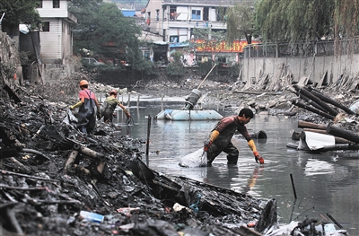 丰门河整治工程于今年9月开工,平均每天清理出600多立方米的淤泥和近百袋垃圾。根据要求,该工程于2013年4月前完成,2013年12月前消除黑臭。记者:蒋超/摄 (康城段、仰义段)