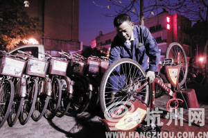 去年5月1日,杭州市成立公共自行车志愿服务总队,千名志愿者分赴杭城大街小巷的公共自行车点,开展车辆检查、保养、维修、保洁等服务。