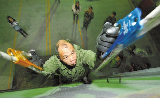 坐膝悬垂,垂直九十度攀爬,这些动作,消防虽然都玩得挺溜,可看一个老人家练得这么卖命,队员们也被感动了。