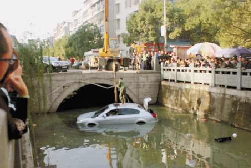 目前,驶进塘河的朗逸轿车已被起吊车吊起,送去修理。