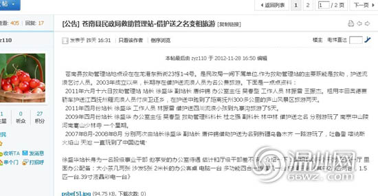 帖子最早发在苍南当地的“龙港论坛”上,帖子称,苍南县救助管理站是民政局一下属单位,2003年成立以来,长期存在借护送流浪人员为名公费旅游。帖子罗列了4次护送流浪者期间旅游的事情。如“2011年6月16日救助管理站站长、副站长等人,租用本田奥德赛轿车护送江西抚州籍流浪人员付庆卫还乡,在护送中跑到了距离抚州300多公里的庐山风景区旅游两天。”帖子后面还罗列了一些人员在景区的合影照片。