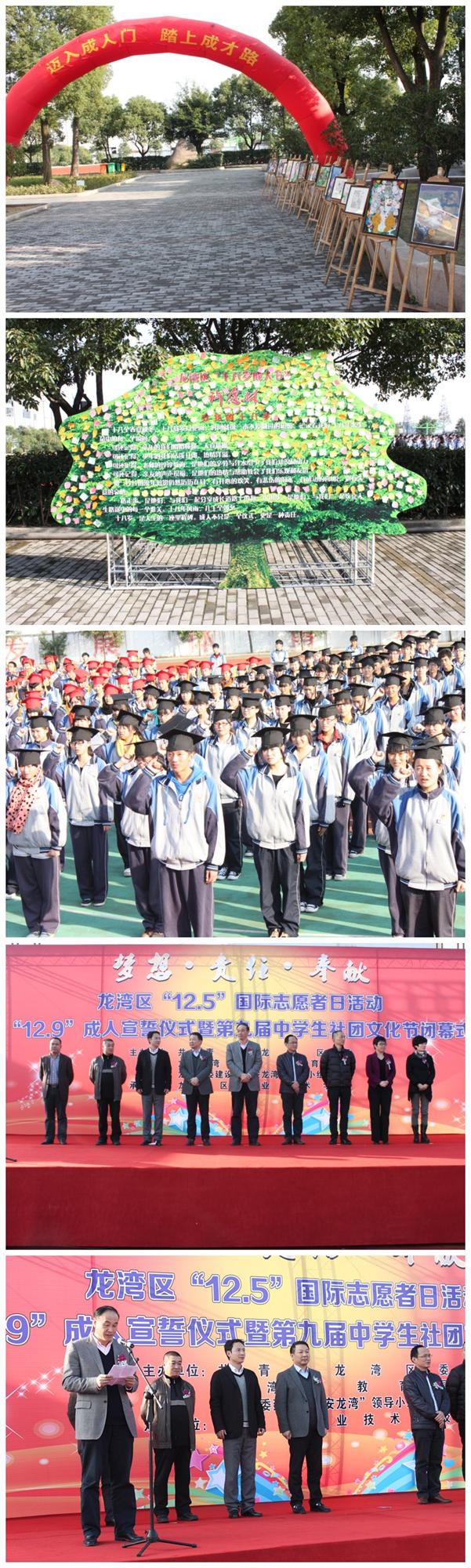 龙湾新闻网讯 近日,由区职技校承办的“梦想·责任·奉献”——“12.9”龙湾区成人宣誓仪式暨第九届中学生社团文化节闭幕式在该校白楼下校区塑胶操场举行。龙湾区委常委、宣传部长王人杰,副区长王生辉,区人大常委会副主任张光羽,区政协副主席张良飞,区团委书记、区青联主席叶铭克,区政法委综治办副主任张婵娟,瑶溪街道党工委副书记张崇微,区教育局副局长徐志毅,以及龙湾区各街道团工委书记、各中学团委书记等参加了本次仪式。该校2011级、2012级全体学生在本次活动中宣誓。