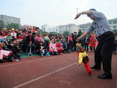 在浙南地区流传了800多年的木偶戏,是温州的文化瑰宝。演出中,泰顺木偶艺术团将传统的木偶表演艺术与现代先进文化相结合,将趣味性与宣传教育相结合,精心编排创作了20多个小朋友喜闻乐见的作品,受到师生热捧。图为木偶们在木偶艺人熟练的操纵下,抬轿、打斗、变脸、换衣,身手灵巧,栩栩如生。
