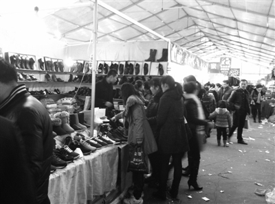 在女鞋品牌印心鸟特卖摊位上,冬天的靴子,以60元、90元、120元、150元四个档的特卖价出售。现场一位负责人介绍,这是公司促销力度最大的一次活动,有一些靴子甚至已低于成本价出售。