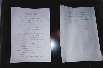 记者发现,该公司门口张贴了一份安全生产会议记录,会议召开的时间就是温州市宏得利合成革有限公司失火当天,上面写着要吸取“宏得利”大火的教训,重点对导热油、锅炉、喷涂车间等进行检查,做好年底安全生产等内容。