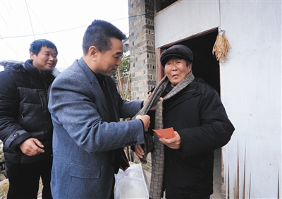 还没进屋,一股木头发霉的味道混着湿漉漉的寒风扑面而来,屋里除了两张床,什么家具都没有,床上被褥很薄。潘时富拄着拐杖坐在长凳上,使劲搓着手取暖。很快,倾注着温暖与爱心的围巾和手套戴在了他的身上,暖心被、食用油和500元的慰问金也送到了他的手中。