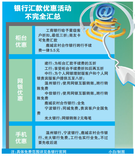 记者搜罗的市区部分银行汇款优惠项目,仅供汇款菜鸟参考。邹雯雯