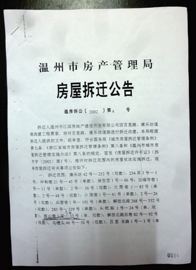 2002年房管部门的拆迁公告明确表明,蒋先生所说的慈山巷32号在拆迁范围内(如左图)。(记者刘宏宇实习生陈丹丹)