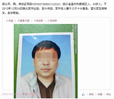 “蒋公开,男,身份证号码3303021968xxxxxxxx,浙江省温州市鹿城区人,45岁人,于2012年12月24日晚从家中出走,至今未回,家中老人妻子儿子十分着急,望大家互相转发,急求帮助。”上月25日晚,网友“寻找蒋公开”发出这条寻人微博。至此,蒋公开借贷跑路事件正式进入公众视野。