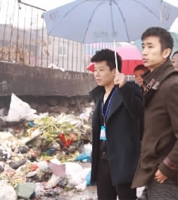 当市民监督团向永中街道领导反映该情况后,当地城建办的工作人员很快就来到现场协调解决问题。永中街道城建办主任王振鹤介绍说,因为永强大道、衙前、城北等村拉到沙门头(垃圾填埋场)路程太远,这里就变成垃圾临时堆放点,这个问题我们反映过多次。由于一直找不到合适的地方建中转站,这个“临时”垃圾堆放点就存在到今天。市民监督团成员认为,这样的中转站就不应该在桥边,如果真的没有地址可选,也应该安装好设备、美化一点,希望有关部门能彻底解决垃圾堆放问题,给附近村民一个良好的居住环境。图为监督团现场督查。陈出摄(陈出焕松崇权夏璐)
