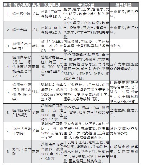 根据《意见》,温州医学院拟申报更名为温州医科大学;温州大学将成为具有博士学位授予权高校,使两所本科院校整体办学实力达到同类学校先进水平。鼓励温州医学院仁济学院、温州大学瓯江学院和城市学院等三所独立学院整体搬迁。创办温州商学院、温州华侨大学等本科院校,扩大本科教育规模,强化办学特色,提升综合实力(详见右表)。