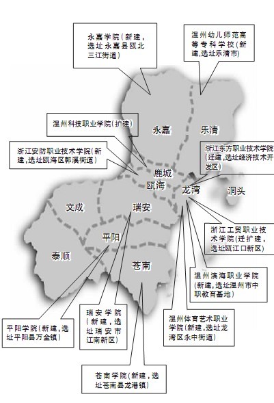 “此次高校布局的调整就是为了提升人才培养质量,注重高校在县域的发展。”市教育局高教处有关负责人表示,《意见》引导现有高职院校通过迁、扩建校园等途径来提升高职人才培养能力。新建一批体现中高职一体化人才培养模式的高职院校,除文成、泰顺外,各县(市)均要创办一所高职院校。(详见右图)。