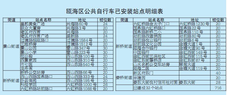截至昨天,瓯海区景山街道、新桥街道、娄桥街道已完成32个公共自行车停车网点的建设。今天,瓯海区1040多辆崭新的公共自行车将正式上路。春节后,瓯海区公共自行车借车网点还将继续扩大至109个,共计3250个桩位。