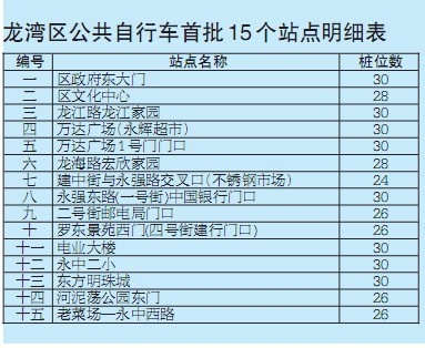 与此同时,龙湾区公共自行车也已完成首批布点,明天起市民可凭卡借车。首批拟定在万达广场商圈、永中街道罗东大街商区、温州高新区科技园(蒲州街道)核心区域以及瑶溪风景区等重点区域,部署66个公共自行车站点,配置自行车2200辆。春节前先开放15个投放点,上路500辆公共自行车。