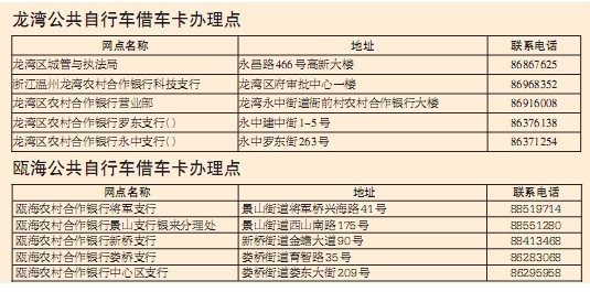 记者还从相关部门获悉,即将投入使用的瓯海、龙湾区公共自行车与鹿城的公共自行车无论是颜色还是外形都保持一致,以显眼的橙色为主色调,只在细微处加以各区的标识,以便区分。同时,市民在3个区公布的办卡网点均可办借车卡,但如果要补卡或退卡,必须到原先办卡的服务窗口办理。