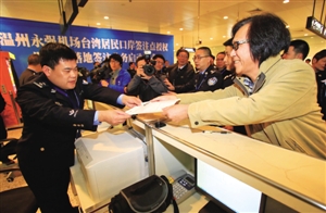 温州网讯昨日下午3时50分许,温州机场到达口内,闪光灯此起彼伏,追逐着台胞许灿欣。他和张嘉宏、黄仁成等3人,成为第一批在温州口岸办理签注的台胞。从昨日开始,市公安局在温州机场设立的台湾居民口岸签注点正式启用,为事先未办妥入境证件或签注,直抵口岸的台湾居民办理证件、签注。