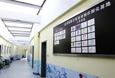 “进驻-孵化培育-评估-出壳”,这是温州市青少年社会组织孵化基地的工作模式。目前已经启用的二楼廊道墙上,挂着20家“入壳”的社会组织图标和预备“入壳”的10家社会组织图标。