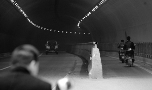 原本三条机动车道设计的隧道,从隧道口开始,一条隔离墩占据右侧车道,隔离出了一条小道,只保留了两条机动车道的隧道,顿时变得有些狭窄起来,加上进入隧道后带来的光线反差,不由得让人感到有些压抑。