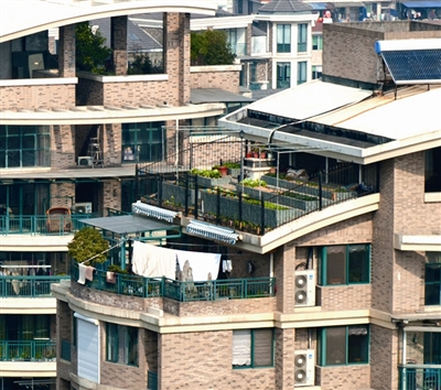 该住宅区有32幢楼房,违建都在顶楼,共分两类:一类是顶楼住户在阳台上搭建玻璃房,共有10多幢;另一类是顶楼住户圈占楼顶公共平台,将其改造成私家花园、菜园。楼顶被改造成私家花园的分别是该小区的2幢、22幢、10幢、12幢,这些楼房通向楼顶的消防通道被住户用防盗门封堵,然后从自家的阳台上,搭建楼梯直通楼顶的公共平台。