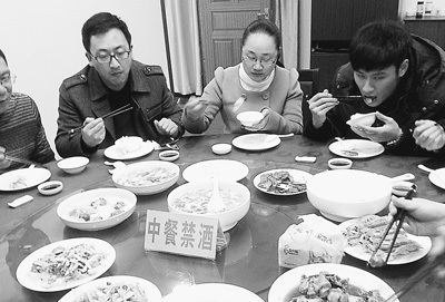 2月18日12点35分,浙江温州乐清市机关餐厅三楼5号包间。榨菜肉丝汤上桌后,一桌“客人”开始了他们的午餐。记者打听得知,温州市司法局一行6人在乐清工作结束后到这里用餐。记者要来了菜单,数了数,共4个凉菜、8个热菜,里面多为榨菜肉丝汤、红烧豆腐干等家常菜。菜单上标注,“共8人,总价407元。”记者粗略计算,人均并未超过温州《落实公务接待“三严四禁”规定实施细则》(下称“细则”)中规定的“人均60元”标准。