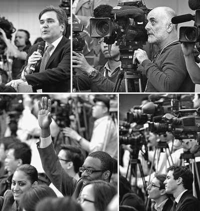 3月13日,十二届全国人大一次会议在两会新闻中心举行记者会。图为部分境外媒体记者在记者会上采访