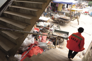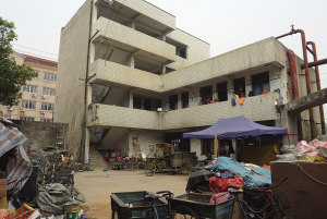 仔细看,这幢四层楼应该是原水厂办公楼,在水厂办公楼一楼,有几个房间锁着门,其中一扇门上还写着“化验室”几个字,另外有一些房间已经成为仓库,里面堆着瓷砖之类的货物,但现场看不出是谁家的仓库。往二楼走,发现原先的楼梯扶手有一部分消失了,残余的也是锈迹斑斑。在二楼,记者发现大部分房间里面住着人。一个拾荒人员在房间里鼓捣废品,边上高压锅里正在烧着东西。这个拾荒人员告诉记者,自己搬到这里不久,是一个老板让她搬到这里来住的,她还称自己是清扫工,但又说不清是哪里的清扫工。在二楼另外一个房间里,记者发现里面铺着2张床,只有一名十岁左右的男孩在里面,问他什么时候住到这里,他一问三不知。来到水厂三楼和四楼,发现里面空无一人,门窗全部不见了。