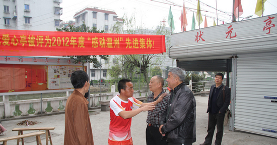 当日上午7:30,毛斌文以一身橙色的残疾人运动会火炬手运动装亮相状元亭,一面“学习雷锋好榜样,争做最美浙江人”的旗帜引人注目。他还带来了8箱牛奶,略表对两个爱心亭突出的慈善工作的敬意。毛斌文向状元亭负责人仔细了解日常公益施粥活动的情况,并仔细查看了宣传栏里媒体报道状元亭慈善义举的信息。毛斌文感慨温州慈善活动氛围浓,特色凸显,希望能把状元亭的慈善工作经验带回去,在他工作地松阳生根发芽。
