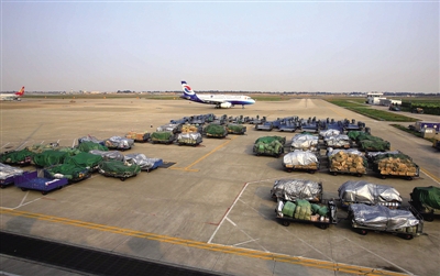 温州机场货物吞吐量正逐年增长。图为在停机坪整装待发的航空货物。刘伟摄