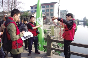 温州网记者和环保志愿者在台州三山河调查水质情况。王建平摄