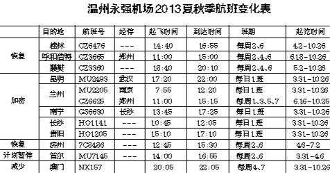 温州网讯3月31日起至10月26日,温州机场开始执行夏秋季航班计划。调整后,恢复桂林、襄樊航线,并于4月6日恢复温州飞济州的国际航线,而至厦门、无锡、连云港三地航班取消。