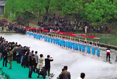 昨天上午,2013年中国(温州)森林旅游节在永嘉开幕。舞蹈演员以山水为背景,以古石板桥、矴步为舞台,翩翩起舞,此情此景幻若人间仙境。赵用叶圣义摄