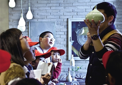 手捧一具意寓八百里瓯江水的树形艺术摆设,陶瓷馆总设计师朱小杰与小记者们轻声交流。他说希望孩子们能有更多自己的想法,创新发展温州传统文化。他所展示这具现代瓯窑在外形上没有一味的仿古,而是运用了传统工艺融入现代元素。在陶瓷的功用上突破了高端陶瓷产品束之高阁只做摆设的作用。而是给它生命,让它走入人们的生活,让它还原到最原始的实用功能。比如他的得意之作——香瓜罐,浑圆的外观,淡青透亮的釉色,里头可放香粉、茶叶等。特别是独特的玉璧底不仅不会损伤桌面,圆润光滑的底部造型还会使整个器具的风格更加统一。小记者们纷纷挤到朱小杰的身边,仔细地听着、看着。