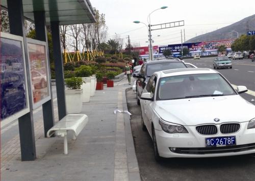 在西侧车库入口附近,有一处公交车站点。但原本是公交车的专用停靠车道,竟也被其他车辆鸠占鹊巢,停在最前面的是一辆白色宝马车。公交车驶来时,只能在站点三米以外的位置停下。此外,设立在广场附近的出租车停靠点,其车道也被违停车辆霸占。