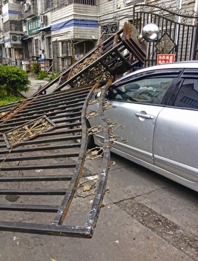 昨天,网友“衣商熊哥”微博爆料称:“风好大,下吕浦菜场对面的铸铁栏杆被风刮倒,一辆白色的本田轿车中招,前挡风玻璃被砸烂。”昨天下午,记者来到事发的下吕浦农贸市场对面大鹏组团10幢楼下,倒落的铁门已经被清理移除,现场留有铁锈碎片。附近群众反映,可能是大风吹倒了铁门,因为铁门正是在风最大的时候倒落的,铁门底部此前已经被侵蚀得挺严重了。