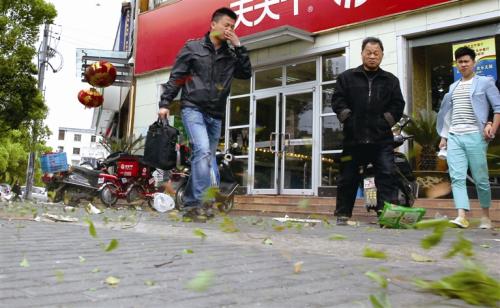 昨天,在温州市区杏花路与马鞍池西路路口,一市民用手遮挡被大风卷起的树叶。农历二月的春风似剪刀,附近不少树枝被吹断。记者王诚/摄