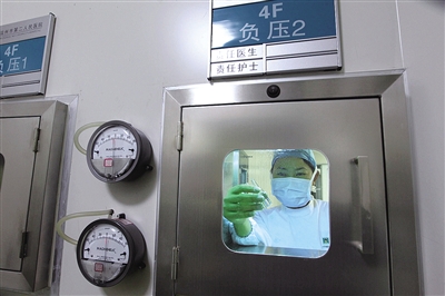 昨晚,温州市中心医院西院区负压病房调试完毕。为了防治H7N9流感,温州另有三家医院6个负压病房准备完毕。图为病房与外界的物流是通过物流传递窗口进行的。赵用摄