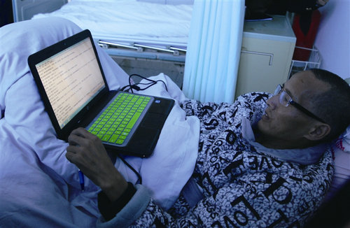 昨天下午,在平阳县人民医院5号楼三楼一病房内,戴着眼镜、穿着棉睡衣的朱康,蜷缩在病床上,用外甥买的笔记本电脑看着武侠小说(如右图)。家人介绍,离家前,朱康体重70多公斤,爱看武侠小说,而如今他的体重降至45公斤。