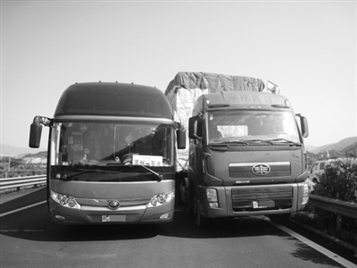 客车司机叫贾某,驾驶浙C牌照客车。4月7日,他驾驶这辆车从温州开往四川。下午3点许,龙丽温高速公路杭州方向116公里路段,贾某打算超越一辆河南牌照货车时,货车突然变道,往快车道打方向。当时,两车相距太近,迫使贾某紧急刹车,这让贾某很恼火,就猛按喇叭警示。