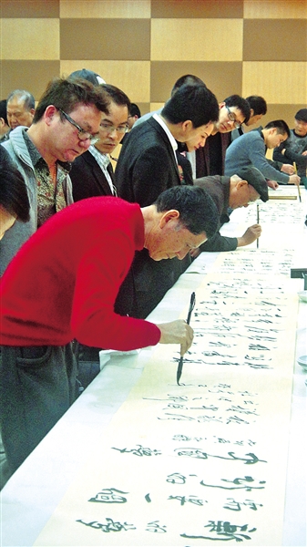 前不久,龙湾区被正式命名为“中国书法之乡”,这是继多张工业领域“金名片”后,该区收获的首张文化“金名片”,也是温州各县市区的首张书法“金名片”。为庆祝这一盛事,4月2日,龙湾区40余名书法家齐聚区文化中心,在悠扬的弦乐声中泼墨挥毫,书写百米长卷“中国梦·罗山韵”,并将墨宝捐赠给龙湾博物馆永久收藏。