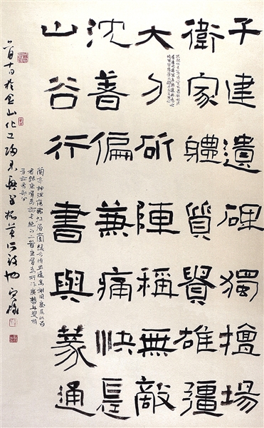 孙老有着中国文化人特有的执著劲儿。为了使书写的内容更为美观,他特地取出了从家中带来的米尺,在预留给他的1.5米长、0.45米宽的空间里给每个字打起了格子。“书法讲究章法,上有多少间隙,下留多少空白,都要事先预留好。”待所有准备就绪,老人从口袋里取出老花眼镜戴上,弯下腰提笔蘸墨开始书写。