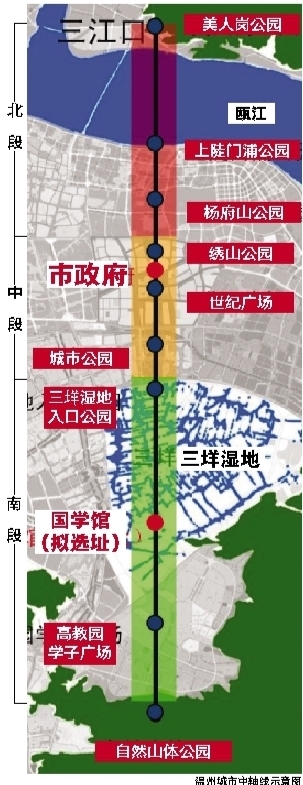 市规划局副局长张静说,历史上,温州以北起江心屿、南至巽山的古城轴线为脉络,形成了以五马街一带为核心的城市中心功能集聚区,也就是人们常说的“老城区”。新的城市中轴线将是温州未来城市发展的“中枢”,这也意味着城市中心今后将随城市中轴线东移。
