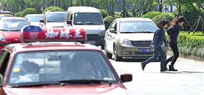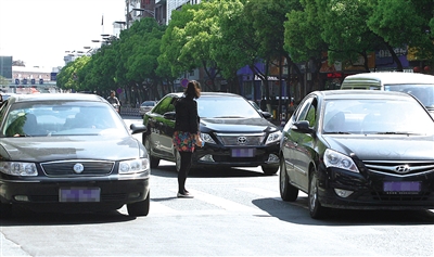 志愿者们选择的4条斑马线,人民东路上的这条斑马线是过往行人最多的,因为地处闹市区,而且各路口都设置有人行横道信号灯,因而经过此处的行车速度都普遍较慢。从总体上看,志愿者们上午观察的半小时内,共有416辆私家车、256辆出租车及223辆公交车通过。其中,当有行人穿过斑马线时,公交车主动停下来让行人穿过的有198辆,而私家车仅有50辆,出租车仅有30辆做到了主动礼让。