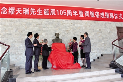 本报讯(夏晶莹徐聿淼)昨天,温籍著名音乐家、温州大学杰出校友缪天瑞的铜像在温州大学落成揭幕,以此纪念缪天瑞先生诞辰105周年,他的3位女儿缪裴芙女士、缪裴菡女士、林剑(缪裴慈)女士从天津赶来,参加揭幕仪式。