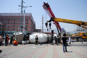 12时26分许,官兵到达现场,只见一辆水泥搅拌车侧翻压在一辆小面包车上,小面包车的车身大梁被压已严重变形,几乎接近地面,两车车头均已面目全非,两车驾驶员分别被困驾驶室内,动弹不得。经过现场勘查发现,水泥车驾驶员被变形的方向盘卡住,而小面包驾驶员被整个变形的车体压在下面,情况十分危急。因水泥车满载着十几吨的水泥,车身较重,消防官兵无法正常破拆,于是与温州市交警大队协商,调派2辆大型起重设备协助救援。救援过程中,为防止车辆起火,消防官兵利用水枪对侧翻的车体进行了降温处理。