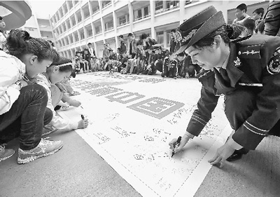 在4月22日“世界地球日”到来之际,4月18日,浙江温州市公安边防支队组织官兵与驻地中小学校开展以“做地球小卫士”为主题的宣传活动。图为官兵与驻地龙湾区灵昆第一小学学生们在印有“促进生态文明,共建美丽中国”的条幅上签名。
