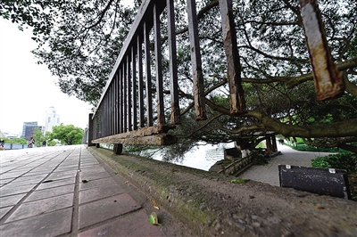 车站大道吕浦桥上的铁栏杆多处烂穿。杨冰杰摄