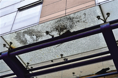 不过,凡事有利有弊。由于玻璃是透明的,从雨篷底下抬头看,玻璃上积累的厚厚的灰尘和楼上住户丢下来的各类垃圾比普通雨篷更显而易见。更让人担心的是,高空抛物导致雨篷上的部分玻璃裂成了碎块,虽然上下有膜包覆,但看起来仍有点令人发怵。记者粗略算了一下,200多米长的玻璃雨篷,有6块玻璃是碎的,这些碎玻璃,成了悬在行人头顶的“不定时炸弹”。