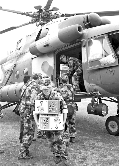 冯玉先的战友驾直升机为灾区送来食品。新华社发